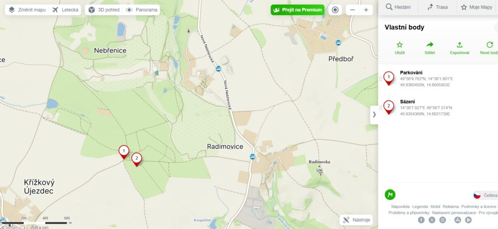 GPS místo sázení – bod 2 – 49.9354369N, 14.6021739E
